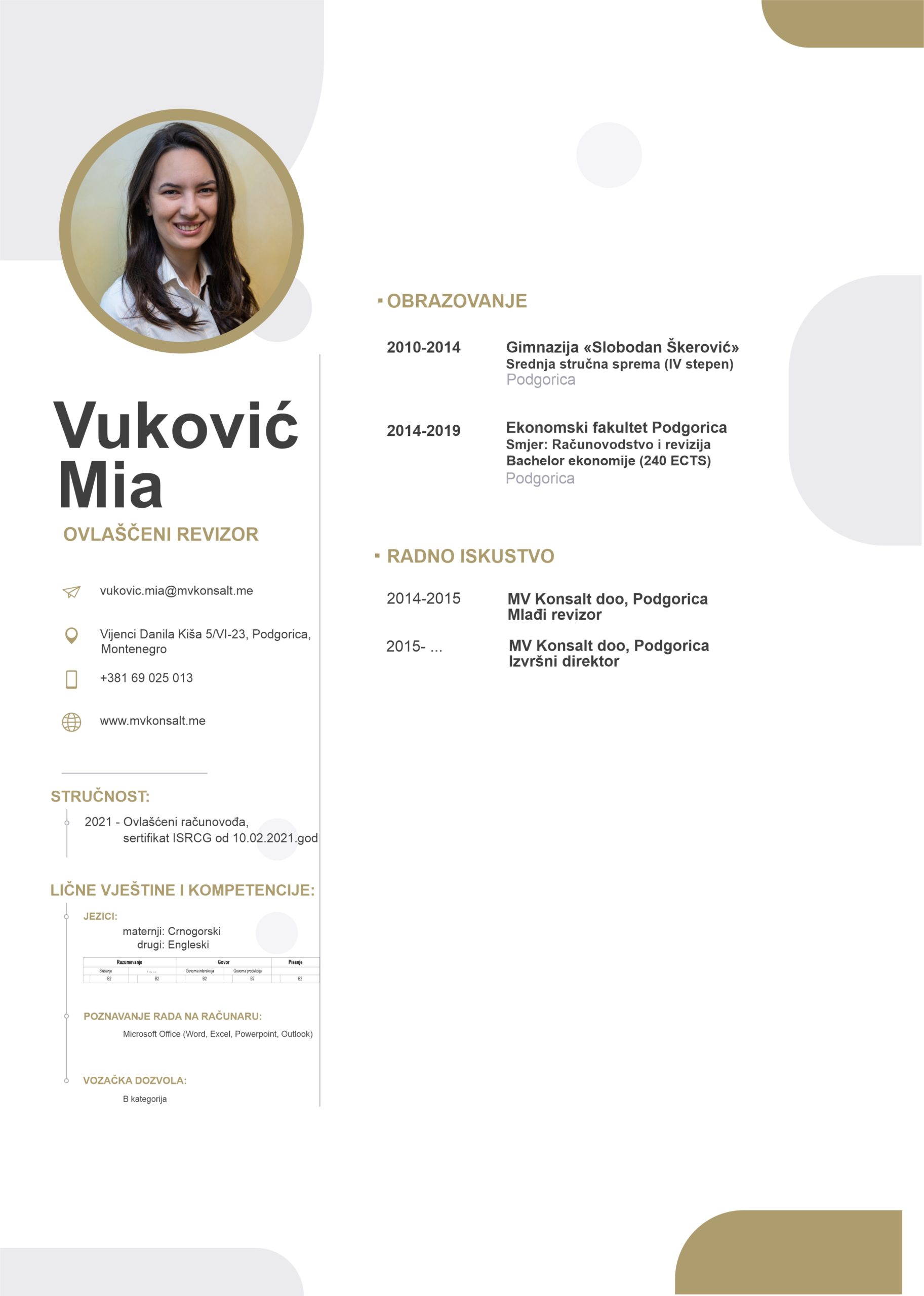 MV Konsalt d.o.o. Podgorica ima dva revizora sa licencom Ministarstva finansija Crne Gore.